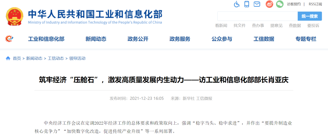 “稳字当头、稳中求进,具体到工业领域,首先就是要保持一定的增长速度。”肖亚庆说,应该看到,工业领域仍面临着大宗商品价格高企、一些领域供应链受到挑战等压力,要把稳定工业增长,特别是明年一季度开好局起好步作为当前最重要的任务,为稳定宏观经济大盘发挥“压舱石”作用。