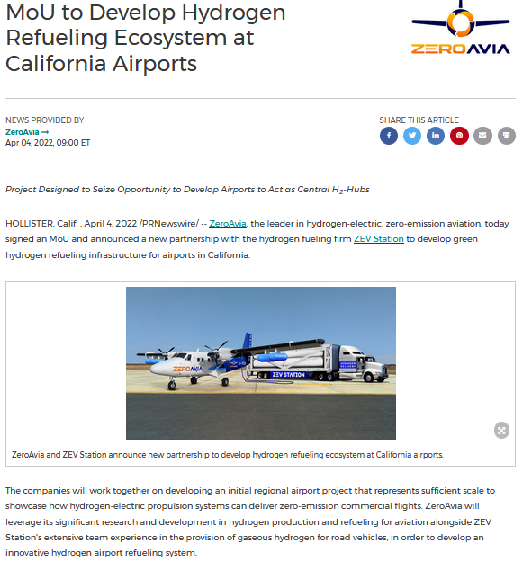 美东时间4月4日,零排放航空氢电领域的领导者ZeroAvia签署了一份谅解备忘录,其宣布与氢燃料公司ZEV Station建立新的合作伙伴关系,为加利福尼亚州的机场开发绿色氢燃料加注基础设施。